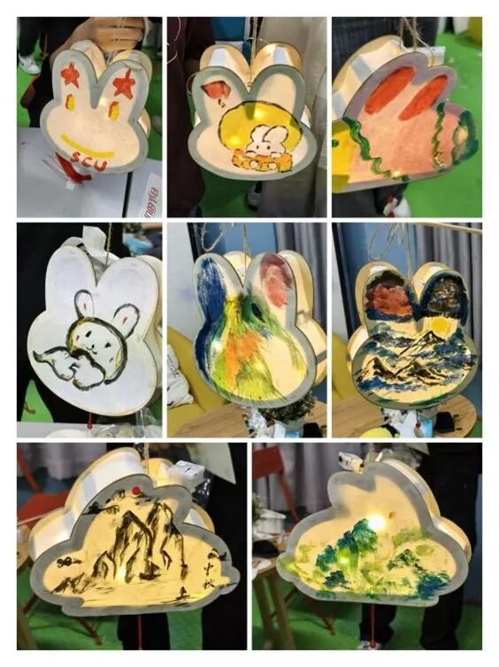 由2025级301、302班组织策划的中秋主题拼图、灯谜活动摊位座无虚席,同学们在图片拼接间还原中秋美景,在灯谜巧思中体会文化内涵。在105、106班策划的灯笼制作摊位上,同学们协同制作玉兔花灯,绘画、组装、点亮。那亮起的不仅是花灯,也更如星火般,将同学们的真挚深厚情谊一并照亮、升温。在303、304班负责的书签漆染活动摊位处,同学们自由调制染缸中流纹的色彩与图案,再用书签胚轻轻浸染,绚烂画卷便现于纸上。在亲手创作间,同学们不但尽情享受了手工艺的独特乐趣,也增进了对中华文化之美的感受和理解。