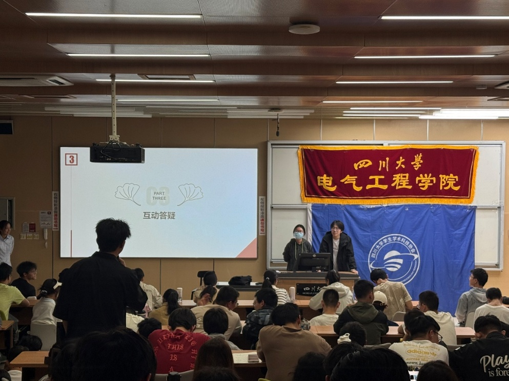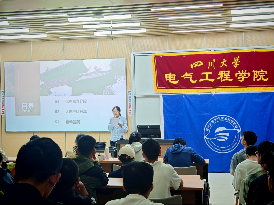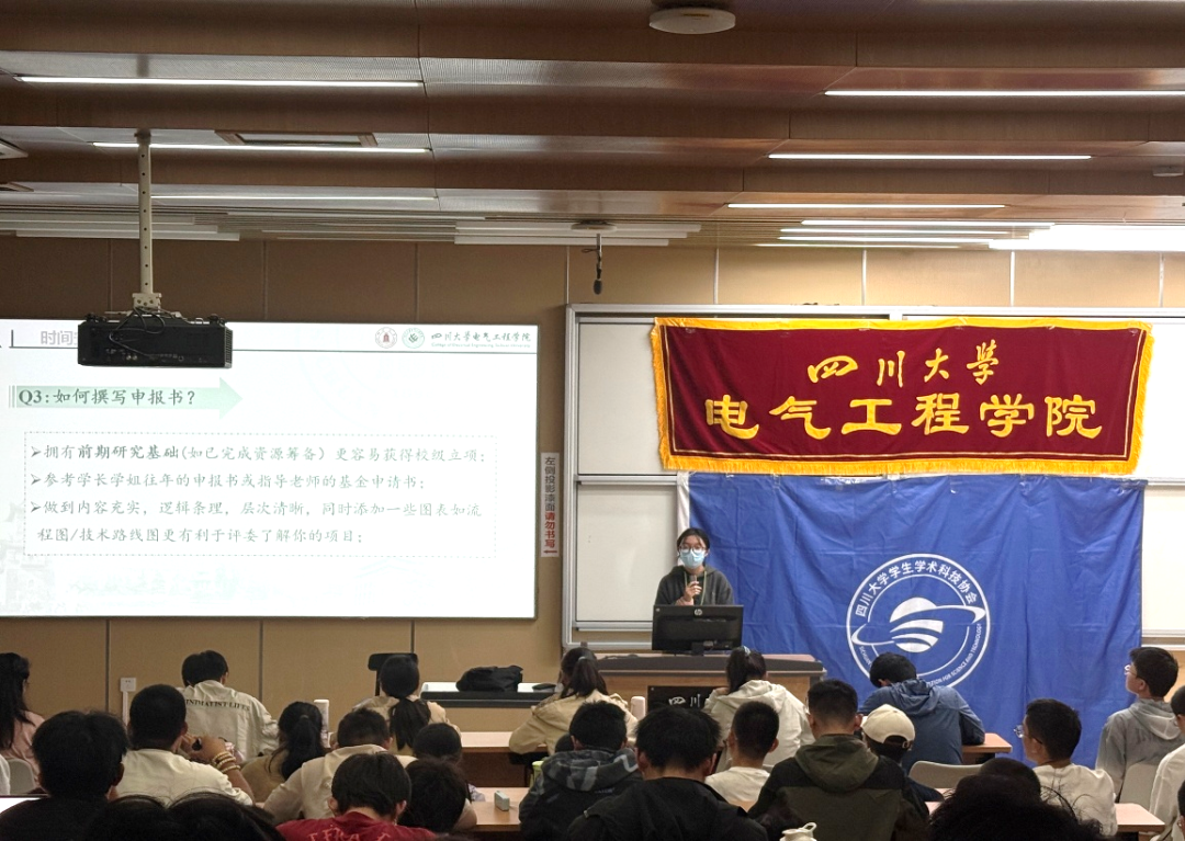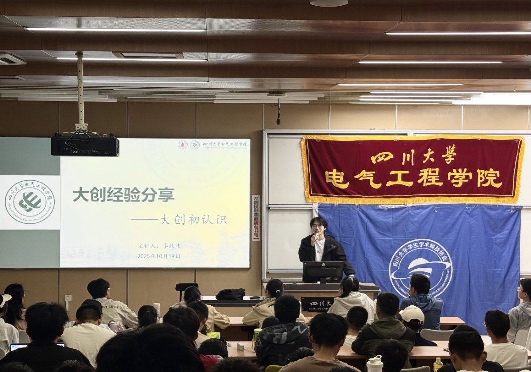 2025年10月19日下午,由四川大学电气工程学院团委学生会主办的“大学生创新创业训练项目”宣讲会顺利开展。活动特邀本科2023 级李政韦同学、2023级石洋溢同学担任分享嘉宾,面向学院大一大二学生讲解大创参赛方法与实战经验,帮助同学们深化对赛事的认知,为后续参赛做好准备。