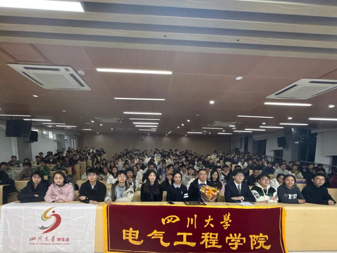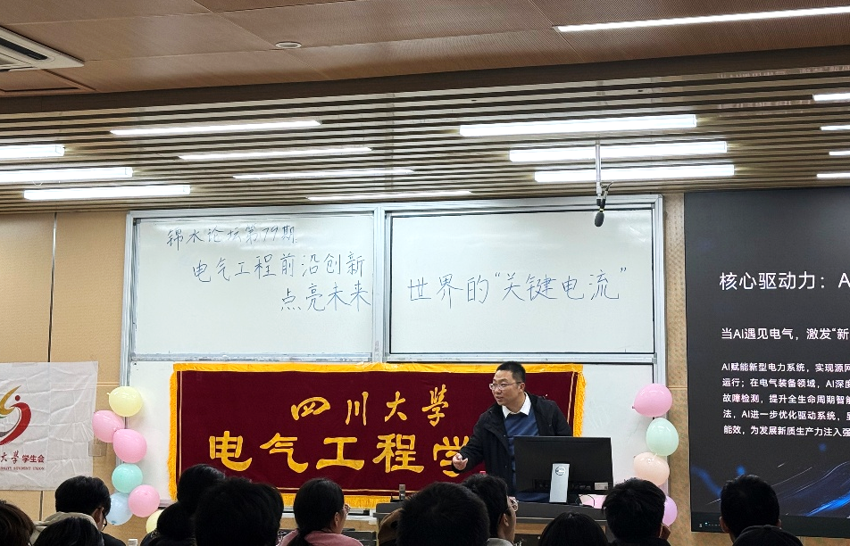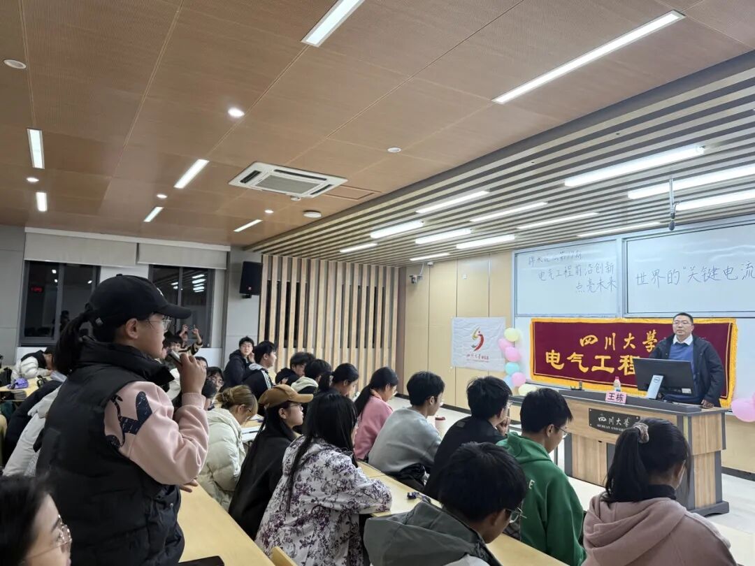 为拓展师生学术视野,增强同学们对电气工程学科前沿与时代使命的认识,2025年11月23日,四川大学“锦水论坛”系列讲座第79期“电气工程前沿创新:点亮未来世界的‘关键电流’”在江安校区综合楼C座C207成功举办。电气工程学院国家级青年人才计划入选者、特聘教授王栋老师受邀担任主讲嘉宾,从“时代之问、前沿突破、人工智能赋能、青年成长”四个板块与同学们分享学科发展图景。校内多学院近300名同学到场参加了本次活动。