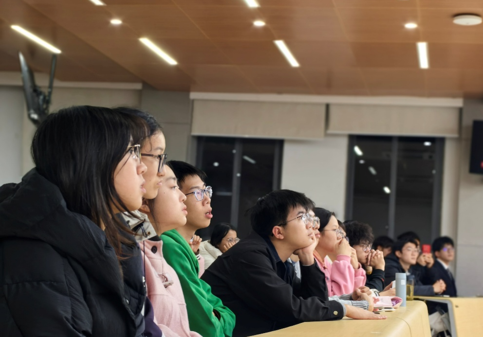 同学们围绕科研训练、学科交叉与行业发展等话题踊跃问,王栋老师逐一回应并与在场师生深入交流,现场气氛活跃有序。