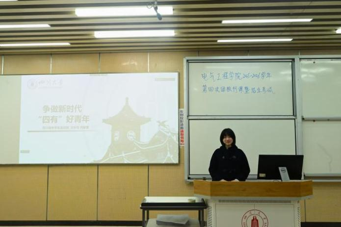 2026年3月15日,四川大学青年讲师团主题宣讲活动在江安校区综合楼C座106顺利举行。四川大学青年讲师团成员汪乐怡围绕“争做新时代‘四有’好青年”主题,结合自身成长经历与青年时代使命,为电气工程学院的同学们带来了一场内涵深刻、内容详实的专题宣讲。